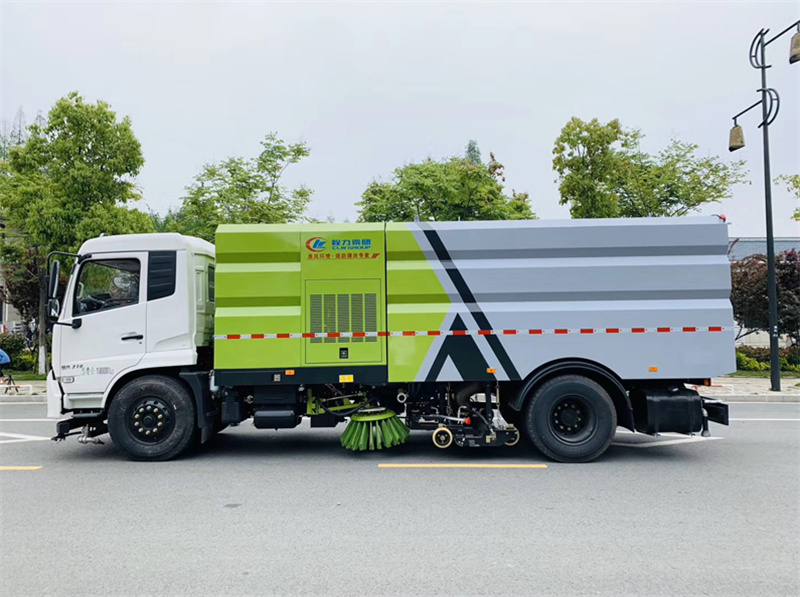 東風18噸洗掃車,帶2個中置掃盤,天錦為康明斯170馬力副發動機;三洋馬達;高壓水泵(前沖/側噴/中噴/后噴霧/沖洗水槍/垃圾箱自潔裝置);高壓路沿清洗噴頭,低壓泵(前沖);不銹鋼垃圾箱;控制器;控制箱;PLC一鍵控制;尾部LED箭頭燈;垃圾箱、水箱均帶防溢低水位報警裝置;倒車及洗掃狀態室內監視器。20m高壓沖洗卷盤。