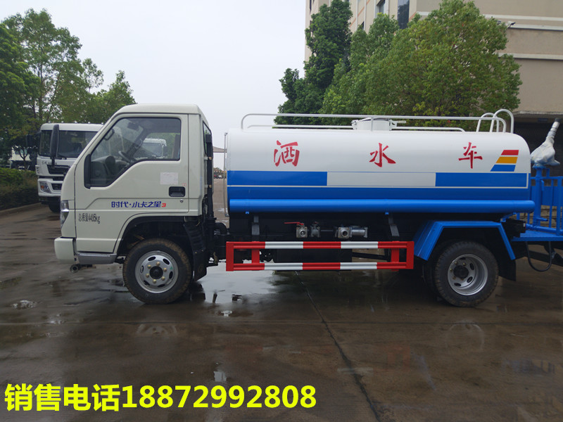 隨底盤選裝駕駛室;品名:,密度:1000千克/立方米,有效容積4.09立方米,罐體尺寸(××)(mm):3400×1600×1100;ABS吸程7米,灑水寬度14-16米,射程25-30米,引水時間<5min,流量60m3/h。前沖()、后灑、帶側噴(花灑)、帶后工作平臺、平臺上安裝綠化灑水高炮(炮噴射形狀可調節:直沖、大雨、中雨、毛毛雨、霧狀、可連續調節,360°旋轉),配消防接口,自流閥,濾網,帶自吸自排功能配備大功率專用灑水泵,泵可自吸自排,安裝過濾網,帶消防接口,可通過消防栓進水,帶自流閥,隨車選裝20米綠化卷盤,可噴灑農藥,罐體金屬漆。罐體有橢圓和方圓罐兩種,可根據用戶的要求定做  發動機可選,云內,朝柴 ,錫柴,全柴