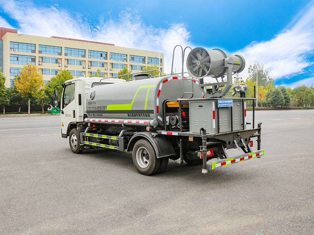 福田H2藍牌5方抑塵車產品介紹產品配置 1.底盤配置: 福田 H2 駕駛室,發動機全柴 130 馬力,法士特 5 檔箱,7.00R16 鋼絲胎,3360 軸距,中控鎖,電動玻璃,T-BOX(全國通用),5T 后 橋,斷氣剎,ABS2.上裝配置: 1、罐體約為 5 方,可加裝 30 型霧炮 2、邊燈帶電,罐體尾部上方標配 2 個紅色示寬燈, 3、標配前噴為鴨嘴直沖,標配后沖,用戶可根據自己的需求,來調 整對沖位置。 4、花紋防滑平臺,炮筒后蓋為定制型螺栓卡扣, 5、前噴、后沖、后灑、側噴,綠化高炮開關球閥均采用 50 大通經 不銹鋼球閥, 6、新式軸承式水炮,更加耐用, 7、40-50 型水泵, 8、防腐法蘭墊片, 9、鋁制后灑,不易炸開 10、罐體自動焊(美國林肯焊機及電源),拼板自動焊接,封頭環 縫焊接,無氣孔,焊縫美觀。 11、側護網、后保險杠、均為螺栓連接,方便拆卸,維修方便。 12、塑料擋泥板,替代鐵擋泥板,更加輕便,用螺栓連接,方便拆 卸。 13、前部、后部主管連接處為 6 孔圓法蘭,不易沖墊