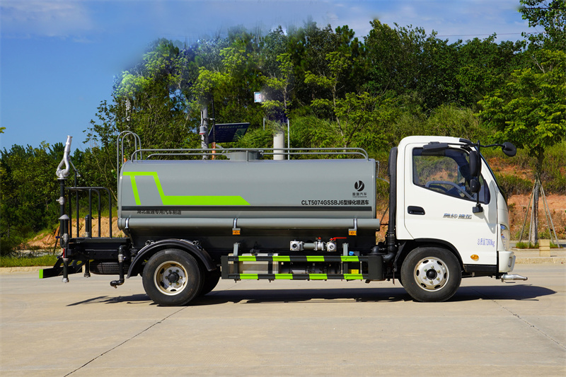 福田奧鈴5方灑水車產品標配前噴(鴨嘴)、后沖、后灑、側噴、后置式工作 平臺,平臺上配置綠化水炮(可 360°旋轉,既可以調成柱狀,也可 以調成霧狀,更可以調成直沖狀、大雨、中雨、小雨、毛毛雨),配 備優質大功率專用灑水泵(可自吸自排,可從河里或池塘抽水到罐體), 取力器,雜物過濾網,消防接口,自流球閥系統、取力器、球閥、濾網 均為國家標準產品