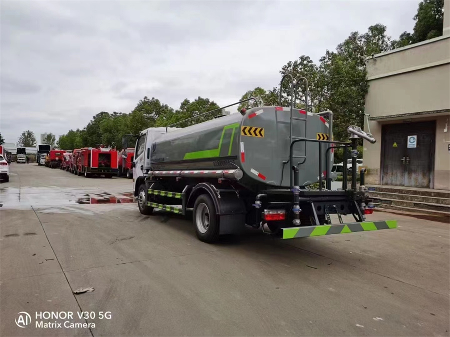 東風多利卡9.35噸灑水車產品標配前噴(鴨嘴)、后沖、后灑、側噴、后置式工作 平臺,平臺上配置綠化水炮(可 360°旋轉,既可以調成柱狀,也可 以調成霧狀,更可以調成直沖狀、大雨、中雨、小雨、毛毛雨),配 備優質大功率專用灑水泵(可自吸自排,可從河里或池塘抽水到罐體), 取力器,雜物過濾網,消防接口,自流球閥系統、取力器、球閥、濾網 均為國家標準產品,主管道加粗,法蘭墊、法蘭盤加厚,大通徑球閥。 整體具備性能優良安全可靠、效率高、流量大、維修方便等特點。