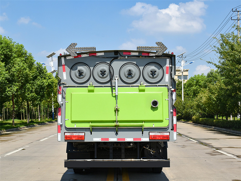 8. 尾部加有噴桿,通過電磁隔膜泵驅(qū)動噴水路面抑塵。箱體上裝:優(yōu)質(zhì)碳銹鋼垃圾箱,3mm 邊板,4mm 底板,用于儲存垃圾,底板整體 折邊無縫焊接,杜絕了泄漏風(fēng)險。簡潔美觀、抗變形性能強、結(jié)構(gòu)可靠性好,同時有 效增加實際裝填容積,超過同類產(chǎn)品,不易變形、耐磨損、耐腐蝕性強。 自卸:液壓缸舉升,垃圾箱自卸。 副發(fā)動機:副發(fā)動機為風(fēng)機運轉(zhuǎn)提供動力。風(fēng)機:副發(fā)動機和風(fēng)機是清掃車的兩大核心部件、副發(fā)動機為風(fēng)機運轉(zhuǎn)提供動力、使 得路面垃圾被吸入箱體內(nèi)部存放,從而實現(xiàn)路面清潔作業(yè)。風(fēng)機采用大功率耐磨離心 式免維護風(fēng)機,無噪音,效率高風(fēng)量大,使用壽命長。 自動離合器:減少風(fēng)機啟動和停止時對發(fā)動機的沖擊。離合器在使用過程中具有高度 耐磨、使用壽命長、低噪音、低油耗量和節(jié)省成本的優(yōu)點。 吸盤:吸盤內(nèi)置滾掃,有效清掃路面垃圾。 濾芯:豎直濾筒,方便清理、拆卸。 電磁閥:海普瑞斯電磁閥組是車輛液壓系統(tǒng)的核心部件,控制整車液壓驅(qū)動,雙向操 作按鈕,包括掃盤升降、吸盤升降、垃圾箱舉升、后門開閉等一系列機械操作,隨車 配備的有電磁閥控制盒罩,有效避免灰塵及垃圾物進(jìn)入盒內(nèi)。 側(cè)邊刷:增加作業(yè)寬度,并有效將垃圾掃入吸盤位置。 影像系統(tǒng):車體后方裝有監(jiān)視探頭,實時監(jiān)控作業(yè)情況并顯示在駕駛室內(nèi)顯示屏上, 最大限度的保證清吸效果。控制開關(guān):集成疊加設(shè)計,PLC 駕駛室電液集中控制,方便操作。 電子隔膜泵:控制尾部噴水桿,噴水抑塵。 應(yīng)急系統(tǒng):可通過手動應(yīng)急液壓泵來控制全車液壓系統(tǒng)。 尾部噴水:作業(yè)完成后,尾部抑塵。