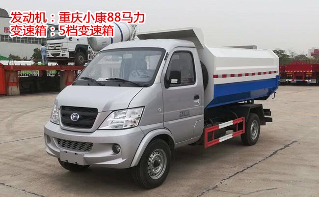 東風小康掛桶式垃圾車,東風小康駕駛室,2760(mm)軸距,渝安淮海69馬力,5檔變速箱,輪胎型號165/70R14。
