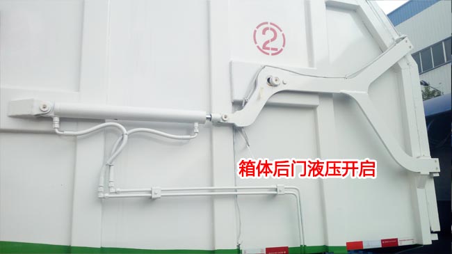 選用3.95米軸距,箱體容積可達12立方米,選用4.5米軸距時,箱體容積可達15立方米。箱體方形,碳鋼材質,邊四底四,頂部密封,箱體后門為液壓開啟,底部雙杠舉升卸料,標配國產油泵,多路閥,取力器,液壓油缸,油泵。
