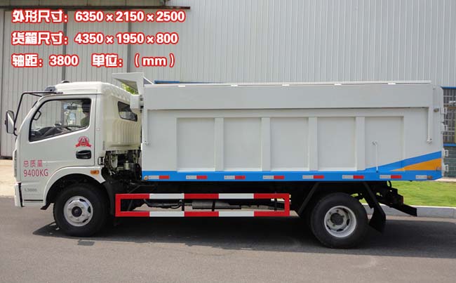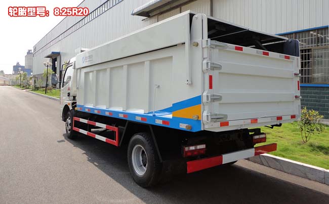 箱體容積7~8立方米,自卸式箱體,箱長4.3米,箱寬1.95米,箱高0.8米,采用4毫米厚鋼板制作,箱頂帶液壓蓋板,可向兩邊展開折疊,箱底雙缸液壓自卸,手動尾門。
