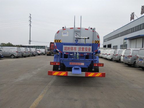 罐體用4MM碳鋼板制作,罐內(nèi)隔板具有防波作用,以減低汽車行駛時罐體液體的沖擊。整車帶一個專用灑水泵(垂直吸程6米),灑水寬度14米,射程28米。多功能灑水車配備2個前沖(噴)(能將路面泥巴、塵土、垃圾沖干凈);2個后灑(能均勻地將水灑在路面,一次灑水寬度14米)、2個側(cè)噴(花灑)(能均勻地將路旁綠化帶澆灌)、帶1個后工作平臺,