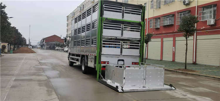 東風天龍9.6米鋁合金拉豬車后門整體升降,裝豬時候從下往上裝第1層,依次第2層,第3層,下豬時候從上往下,鋁合金拉豬車比之前不銹鋼拉豬車自重更輕,箱體兩邊可以左右軒開,人可以站直在箱體內清洗更方便