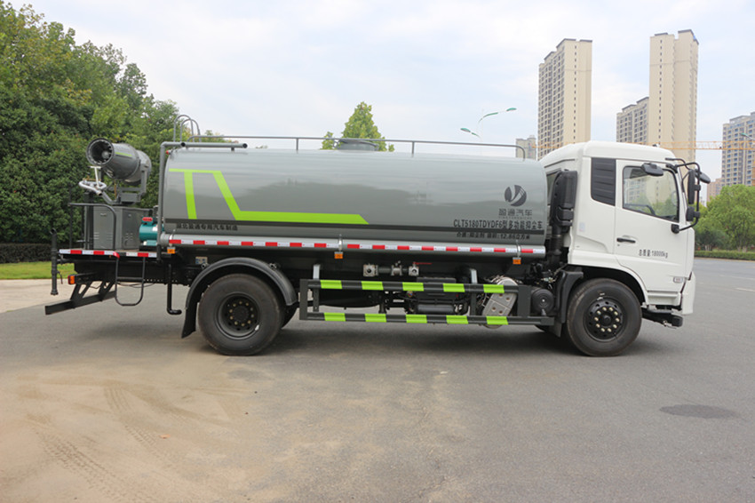 新款國(guó)六排放東風(fēng)天錦12-15噸灑水車專用功能為:前沖后灑,側(cè)噴,罐體后帶工作平臺(tái)加護(hù)欄,平臺(tái)上安裝綠化灑水高炮,射程28米左右,可調(diào)節(jié)多種形態(tài)(大雨、中雨、霧狀),配備大功率專用灑水泵,泵可吸自排,帶自流閥,帶消防接頭,帶過(guò)濾裝置,兩根吸水管。另外該車可選裝A、后部帶弧形噴霧和LED箭頭指示燈;B、后部帶LED箭頭指示燈;C、后部帶弧形噴霧裝置。
