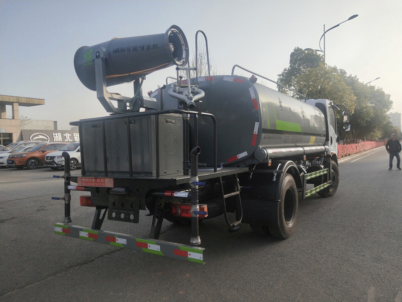 1、灑水車前裝有鴨形噴嘴或圓頭沖嘴,后面裝有圓柱開灑水噴嘴或蓮蓬頭噴嘴,后部有一工作平臺,裝配有水炮。后部還可裝8個噴嘴(選裝);