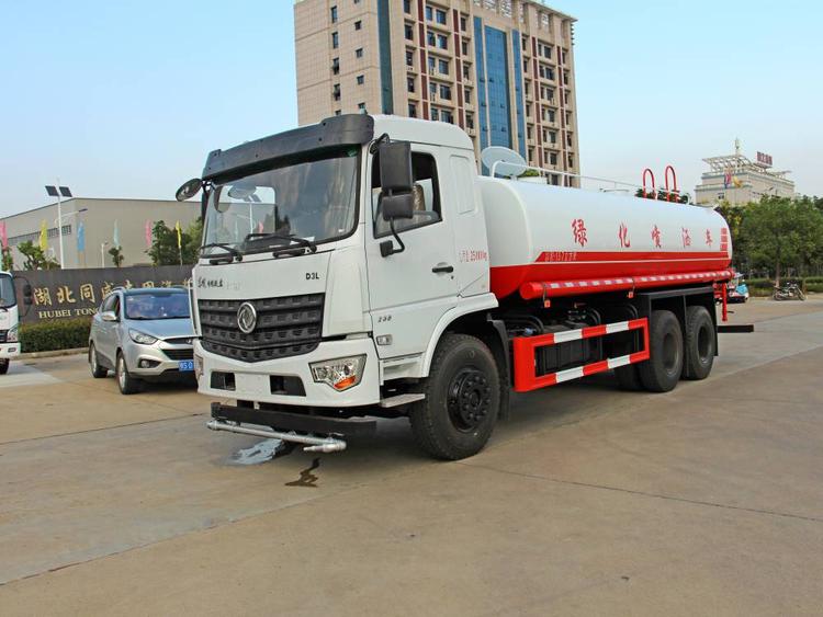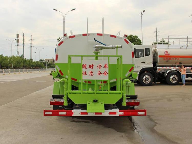 具有前沖、后灑、側(cè)噴(更換噴頭后變?yōu)閭?cè)花灑)、后置式工作平臺(帶踏梯,四周有安全護(hù)欄)、平臺上設(shè)置有高壓水炮(可360°旋轉(zhuǎn),可調(diào)成柱狀,射程28米;也可調(diào)成霧狀,射程14米,可連續(xù)調(diào)成:直沖狀、大雨 、中雨、小雨、毛毛雨),整車灑水寬度大于14米。配備大功率灑水泵,取力器,雜物過濾網(wǎng),通用65型消防接口(可通過消防栓加水)、1套自流球閥系統(tǒng)(可自吸自排,垂直吸程6.5米),2根引水鋼絲膠管(帶陰陽快速接頭),配鎖,水位計,作業(yè)高音喇叭。兩側(cè)及后加強(qiáng)型保險杠,防滑爬梯,膠管儲存筒。