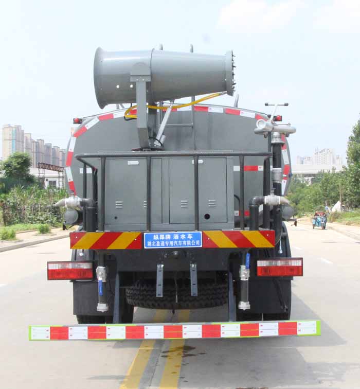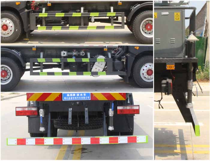 該車主要用于城鄉園林綠化,路面噴灑,除塵和降溫;主要裝置為水罐及噴灑裝置;隨底盤選裝駕駛室,隨底盤選裝燃油箱,電瓶,尿素罐,儲氣筒左右安裝位置;罐體總容量:11.45立方米;罐體有效容積:10.9立方米;罐體外形尺寸(長×長軸×短軸)(mm):5200×2300×1400,4400×2350×1600;側、后防護材料均為:Q235碳鋼,連接方式均為:螺栓連接,后部防護截面尺寸(mm):120×50,后部防護離地高度(mm):450.ABS系統生產廠家,型號:焦作博瑞克控制技術有限公司,J ABS;襄陽東風隆誠機械有限責任公司,ABS/ASR-24V-4S/4M.選裝噴灑裝置樣式,選裝弧形噴灑裝置,選裝箭頭燈裝置,選裝自動球閥安裝位置,選裝水炮支架位置,選裝無高位花灑裝置.選裝罐體頂部方形罐口,選裝車輛前部鴨嘴裝置,選裝電子炮樣式,前伸500mm時,車輛長度為8950,8200mm.選裝后部自流口裝置,后部作業燈僅在作業時開啟,車輛行駛過程中不可開啟.