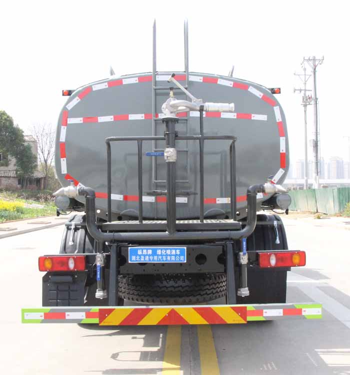 選裝噴霧裝置樣式;ABS型號:3631010-C2000,ABS-E 4S/4M;ABS生產企業:東科克諾爾商用車制動系統(十堰)有限公司,威伯科汽車控制系統(中國)有限公司;隨底盤選裝駕駛室,選裝噴灑裝置;側、后防護材料均為:Q235碳鋼,連接方式均為:螺栓連接,后部防護截面尺寸(mm):120×50,后部防護離地高度(mm):450;罐體有效容積:9.64立方米;罐體外形尺寸(長×長軸×短軸)(mm):4000×2300×1540,4200×2300×1450;該車主要用于城鄉園林綠化噴灑;主要裝置為水罐及噴灑裝置;選裝罐體頂部高位花灑裝置及罐體頂部箭頭燈裝置,選裝氣動球閥安裝位置,選裝車輛前部鴨嘴噴灑裝置,選裝油箱電瓶安裝位置.選裝罐體頂部方形罐口,選裝工具箱.選裝前部電子霧炮樣式.選裝前部不帶電子霧炮.當前部不帶電子霧炮時,車輛長度7750mm,7800mm,無前伸;當前部選裝電子霧炮時,車輛長度8250mm,8300mm,前伸500mm.后部作業燈僅在作業時開啟,車輛行駛過程中不可開啟.