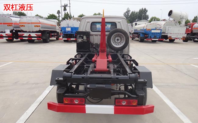 配套2~3立方米勾臂垃圾箱,高強度主勾臂,雙杠液壓,采用國產油泵、多路閥、液壓油缸、車身顏色根據客戶要求更改,尾部帶鎖緊裝置、滾輪。