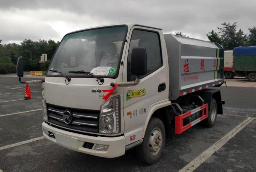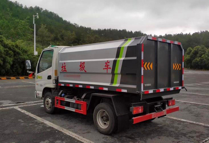 箱體容積3~4立方米,碳鋼邊三底四,國產油泵、多路閥、取力器、油缸,卸料方式為底部雙杠液壓舉升自卸,駕駛室外操作,鐵桶掛架,后門機械鎖緊,手動開門,可選液壓開門。