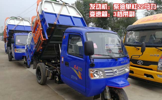 時風風云2號三輪掛桶式垃圾車,時風全封風云2號駕駛室,單杠22馬力柴油發動機,3檔帶副變速,方向盤式轉向,軸距2990,前輪6.00-14,后輪7.00-16。