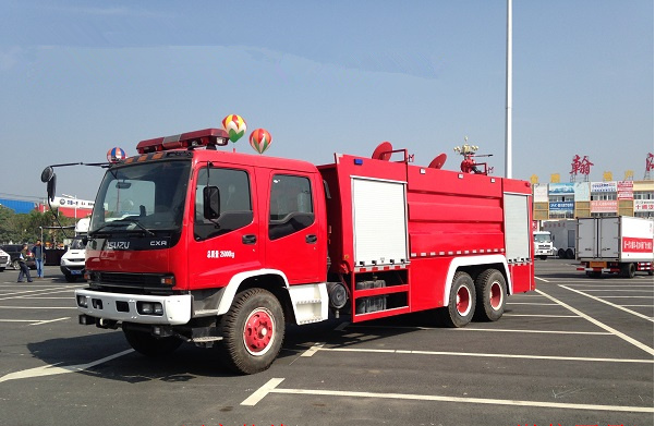 五十鈴11-12噸雙橋消防車采用慶鈴QL1250WPFZY底盤改裝,平頭雙排駕駛室,五十鈴6HK1-TCH發動機,300馬力,罐體容積11-12立方米(水罐容積8立方米,泡沫罐容積3立方米);整車結構緊湊,方便靈活,動力性能好,車速高,能自由進出鄉村狹窄道路及小區,具有大型消防車的全套消防功能,上裝箱體的上裝骨架全部采用引進歐洲技術生產的鋁合金型材制造,整車的重量減少,機動性能和整車載重量提高。除了裝備消防水泵及器材以外,還設有較大容量的貯水罐及水槍、水炮等?蓪⑺拖廊藛T輸送至火場獨立進行撲救火災。也可以從水源吸水直接進行撲救,或向其他消防車和滅火噴射裝置供水。在缺水地區也可作供水、輸水用車,主要適用于大中城鎮、鄉村狹窄街道、城市小區、繁忙的批發市場等場所的一般物質滅火,閑暇時可用于園林噴灌、道路清灑。