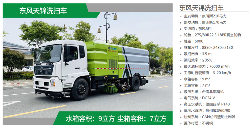 國六東風天錦洗掃車上裝配置:中置2掃盤、吸嘴、三洋馬達、康明斯170馬力副發動機,德國原裝進口高壓水泵(前沖、側噴、中噴、后噴霧、側沖洗車水槍、垃圾箱自潔裝置)、萬向高壓路沿清洗、低壓泵前沖、不銹鋼水箱、垃圾箱;不銹鋼高壓管路、施耐德控制開關、美國傳感器、尾部LED箭頭燈、機油、垃圾箱、水箱均帶防溢或低水位報警裝置;倒車及洗掃狀態駕駛室內監視器、18m高壓沖洗卷盤、最大洗掃寬度3.5m;高壓沖洗高度≥21m。可選裝前置雪鏟、掃雪滾。